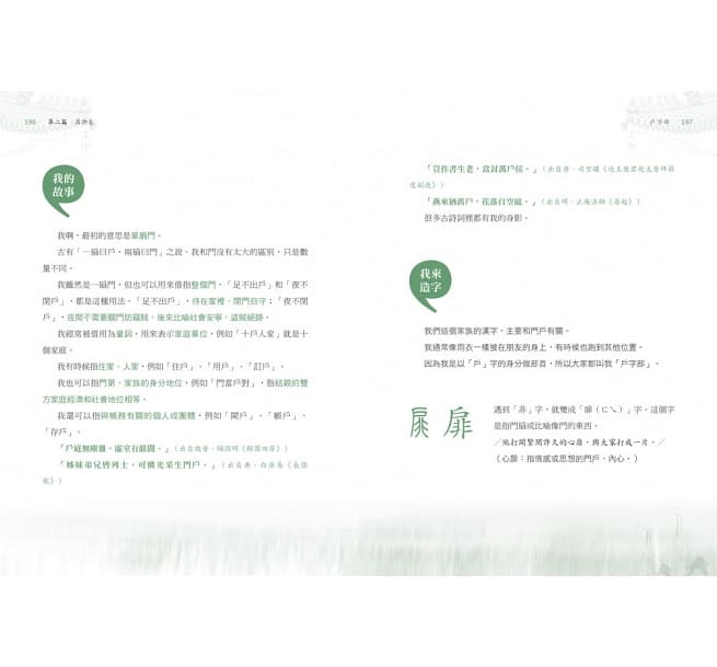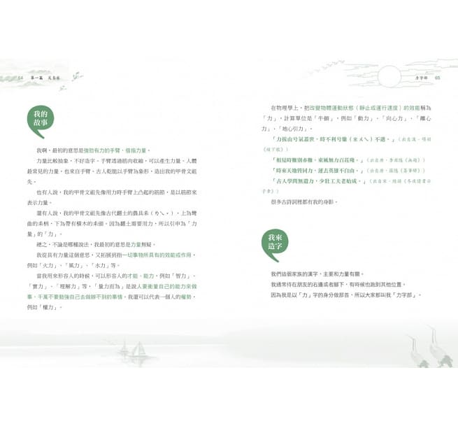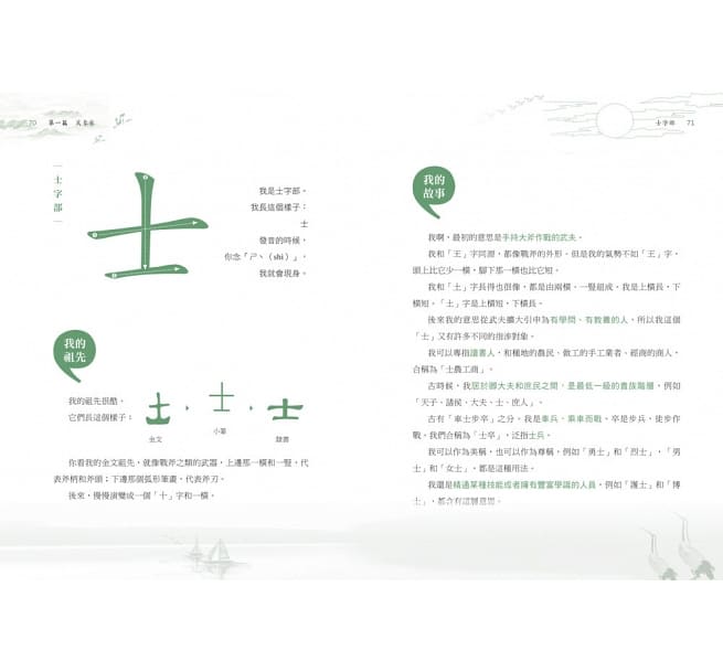 每一個部首由「我的祖先」、「我的故事」、「我來造字」三部分組成,從簡到繁,循序漸進介紹各個部首,透過妙趣橫生的文字說明,激發大朋友和小朋友們的奇特想像、思考方式,並能學習巧妙地跨越和銜接,舉一反三,衍伸出更多的單字和詞語。