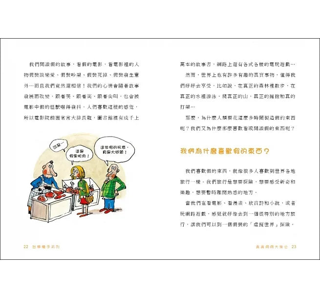 有趣的是,人類似乎不停的製造假的東西:我們發明了童話故事,也發明了電影、小說、電玩遊戲…可是世界上也有許多真的事物,它們也很有趣,譬如在真正的森林裡散步,在真正的海裡游泳,真正的擁抱…但是,為什麼我們那麼喜歡看或閱讀這些假的東西呢?