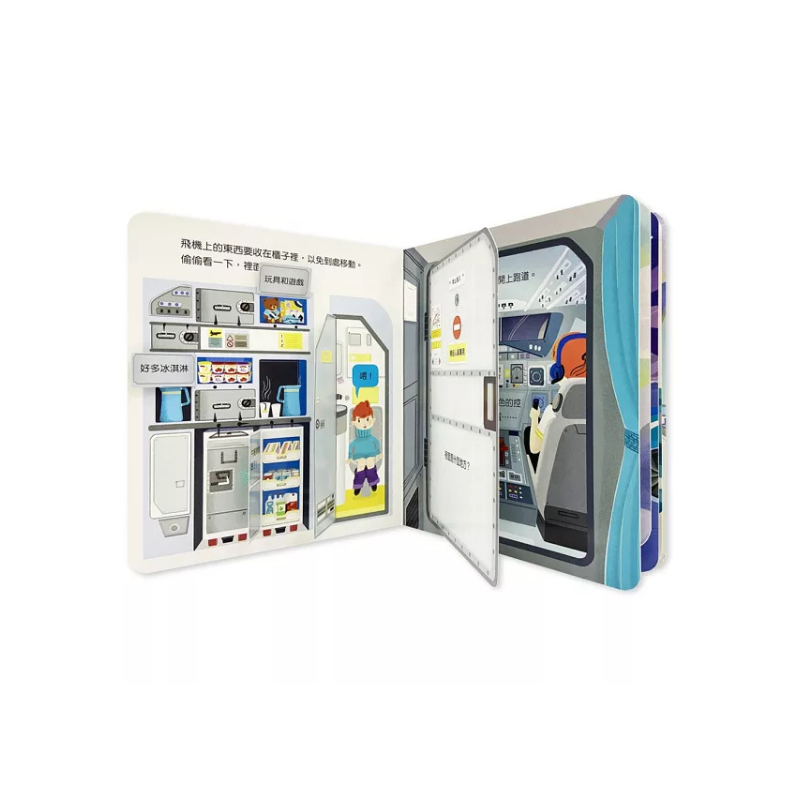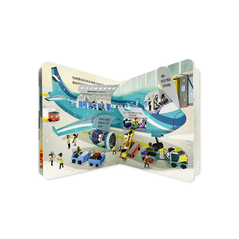 這本翻翻書透過精緻的插圖與生動的文字,帶領孩子深入探索飛機的運作過程。從飛機在機場的準備、加油、裝載行李,到駕駛艙、飛機的起飛與降落,每一個小細節都展現在孩子面前。
