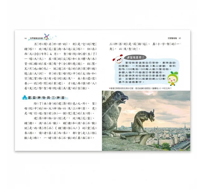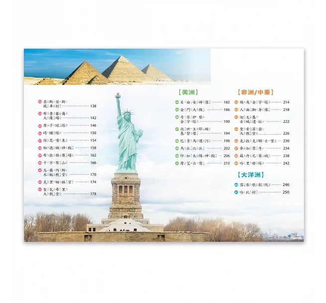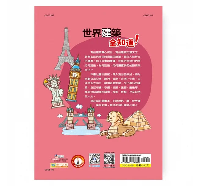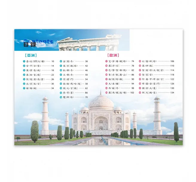 本書以圖文搭配、深入淺出的敘述,將內容劃分為亞洲、歐洲、美洲、非洲/中東、大洋洲五大部分,精選各地區、文化著名建築,涵括塔樓、寺廟、宮殿、遺跡、雕像等、詳細介紹建築背景、技術、特點,乃至自然與人文。帶領孩子遊歷世界各地,認識令人嘆為觀止的新奇建築,從中了解歷史與文化,進而培養美感建立世界觀。