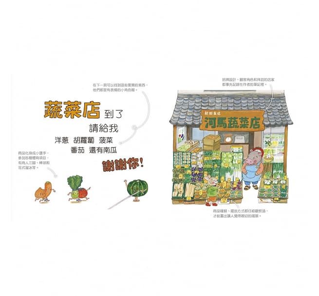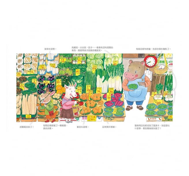 這是一本可以觀察,還能一起玩的書。親子共讀的時候,不妨和孩子玩些互動的遊戲,比如問問孩子,最想去哪家店買東西?午餐想吃煎餃還是味噌拉麵?或者,媽媽今天要煮洋蔥牛肉和蛤蜊湯,要去哪些店呢?當孩子歪著腦袋一邊想的時候,同時也增進了生活能力呢!