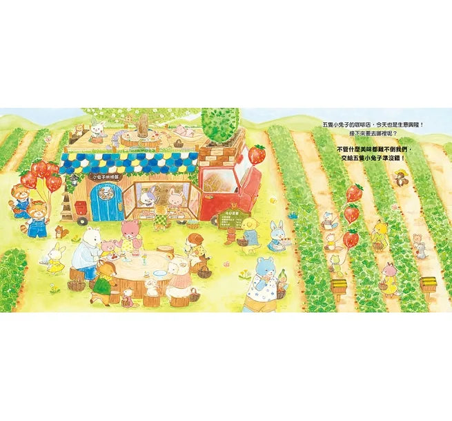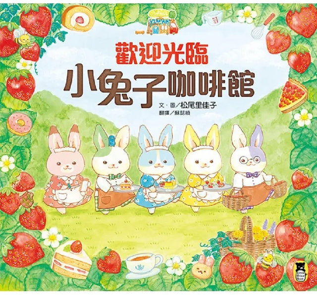 《歡迎光臨小兔子咖啡館》是深受讀者喜愛的《媽媽一直在你身邊》作者松尾里佳子最新創作!這次的主角是5隻可愛又擅長料理的小兔子:小梅、噗噗、露娜、白白和咪魯,他們來到正在舉辦草莓祭的草莓田,和綿羊、小鹿、浣熊、松鼠一起採草莓,做出各種美味的草莓料理來招待客人!首先光臨的是小羊,他點了草莓奶油三明治和草莓鮮果汁,接著,小鹿點了草莓聖代和草莓紅茶,連不小心迷路的小熊都得到特製草莓蛋糕,他破涕為笑,開心的吃著蛋糕,等待熊媽媽和熊爸爸來接他……