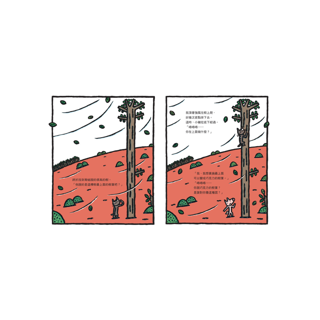「穿過這片樹林就會看到一棵很高的樹,那棵樹最上面的樹葉會變成巧克力。」青蛙說。