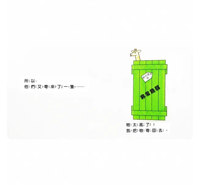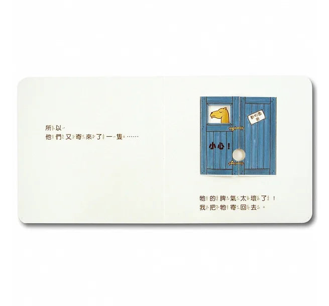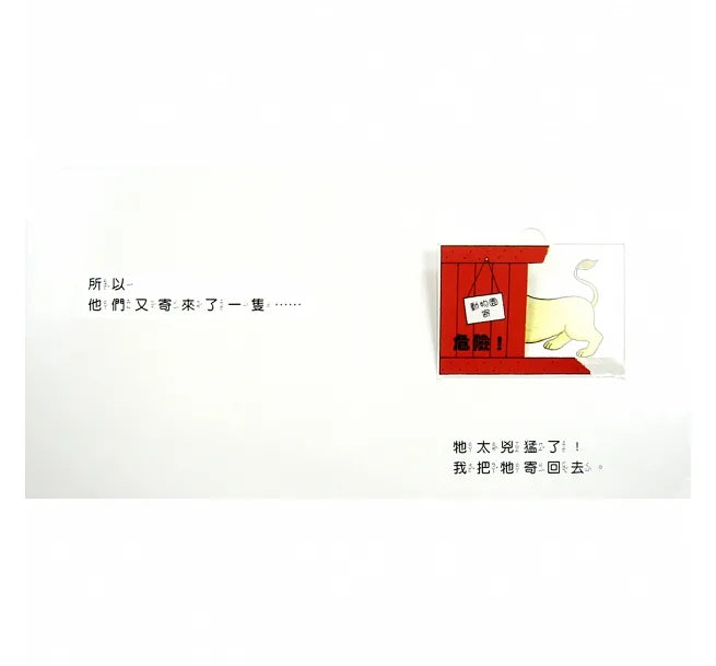 這是一本玩具翻翻書,故事中有一個小小孩想要養寵物,於是寫信向動物園要,沒想到,動物園寄來各式各樣的寵物,就是沒有他要的,直到動物園寄來一隻狗,小小孩終於找到剛剛好適合他的寵物。