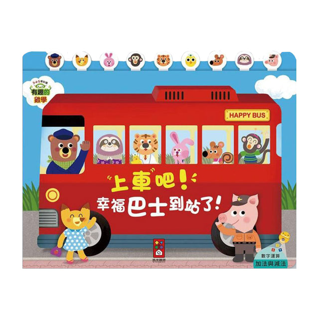 《上車吧!幸福巴士到站了!》藉由可愛動物們上下公車、拉動小卡、以及翻翻頁面的互動模式,簡單學習加減法運算,另外也在閱讀本書、學習數學中,引導出交通安全觀念和在大眾場合該有的禮節。