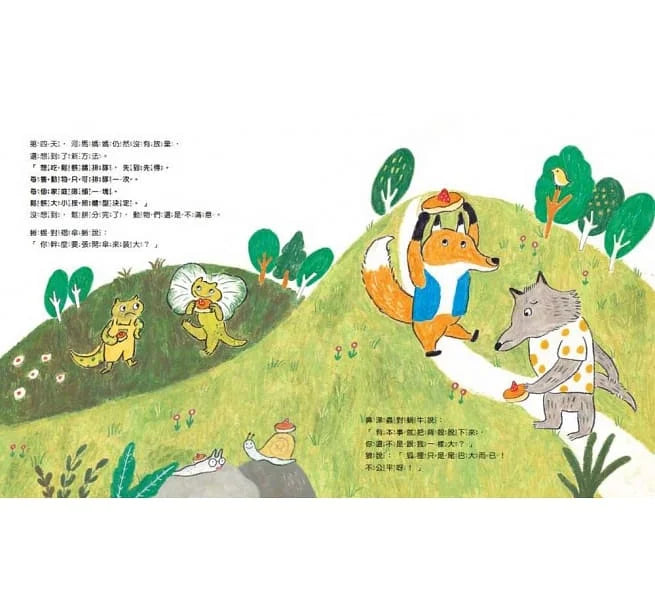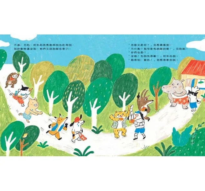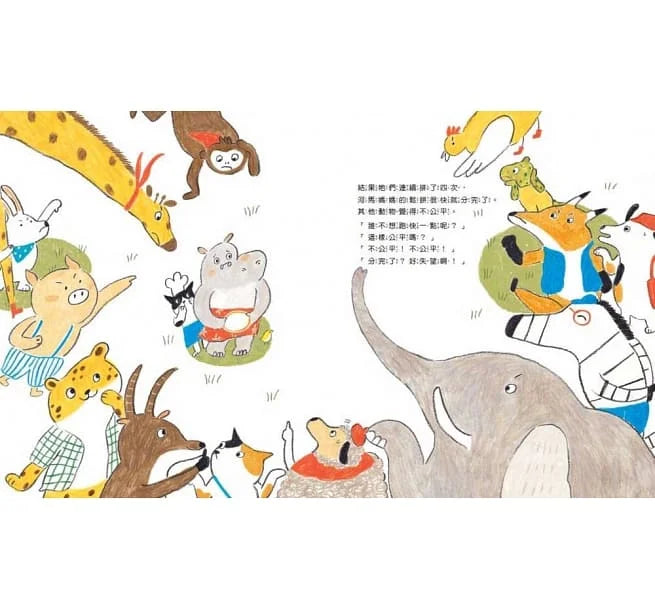 為了不讓大家爭先恐後,她訂下規則:「想吃鬆餅請排隊,先到先得。」結果,花豹、羚羊和斑馬跑得快也吃得快,連續排了四次,其他動物覺得好不公平。
