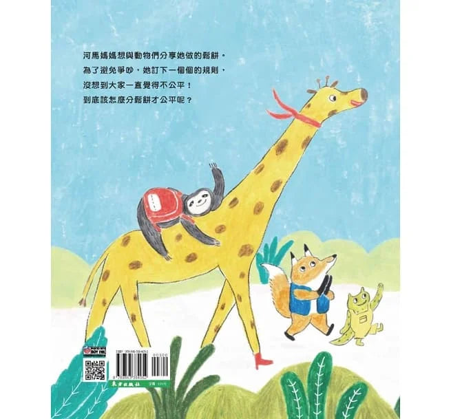 為了公平,河馬媽媽又加上一條新規則:「想吃鬆餅請排隊,先到先得。每隻動物只可排隊一次。每個家庭限領一塊。」但是這樣真的公平嗎?螞蟻家族吃不完,黑熊一家卻不夠吃……