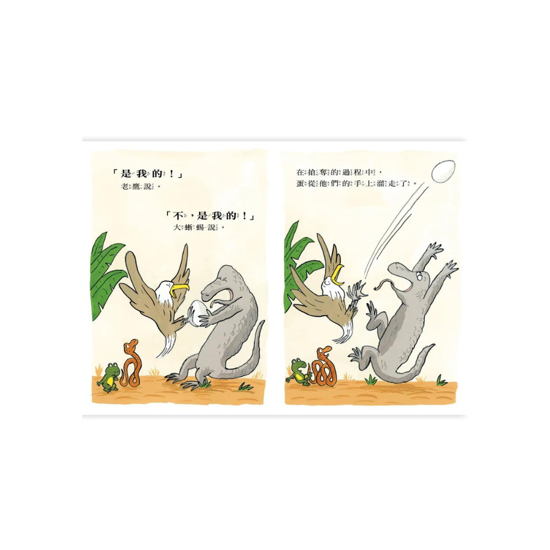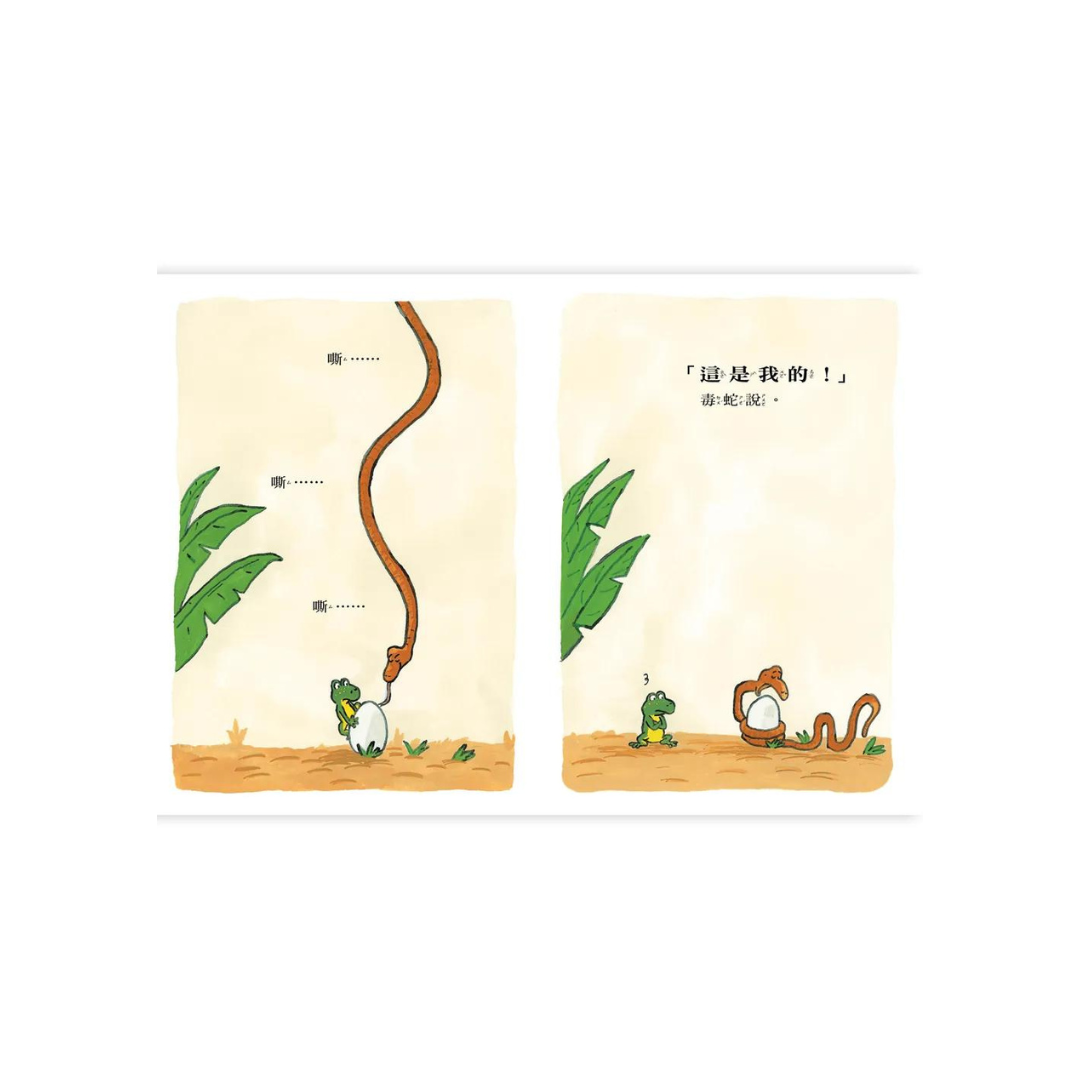 在好深好深的叢林裡,一隻青蛙發現了一顆蛋,他開心的抱著蛋說:「這是我的!」沒想到出現了一條蛇,說:「這是我的!」接著又出現了一隻老鷹,說:「這是我的!」大蜥蜴也來搶這顆蛋,他說:「這是我的!」老鷹和大蜥蜴為了蛋大打出手,接下來會發生什麼事呢?蛋到底是誰的?