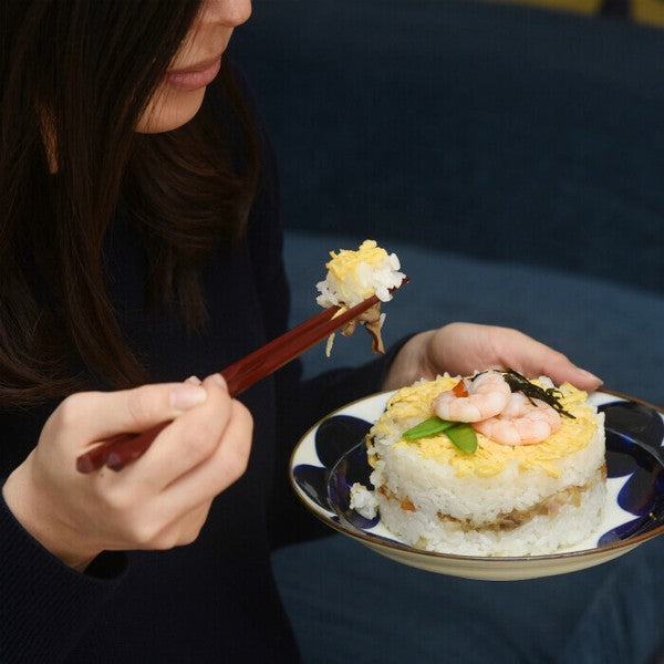 Each plate is hand-painted with rich indigo pigment (gosu), then burnished and bordered with warm brown glaze. The ivory base adds warmth and balance, while the textured surface gives each piece an earthy, handcrafted touch.