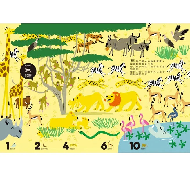 數一數,熱帶草原上有幾隻斑馬?河流裡有幾隻小青蛙?