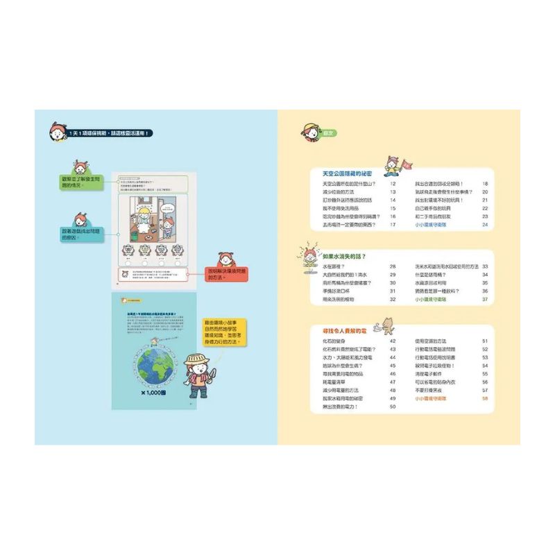 從「減少垃圾」到「節約用水」,從「降低耗電」到「保護動物」,每一頁都把永續生活變成孩子可以做到的小步驟,幫助孩子建立面對未來世界的重要素養。