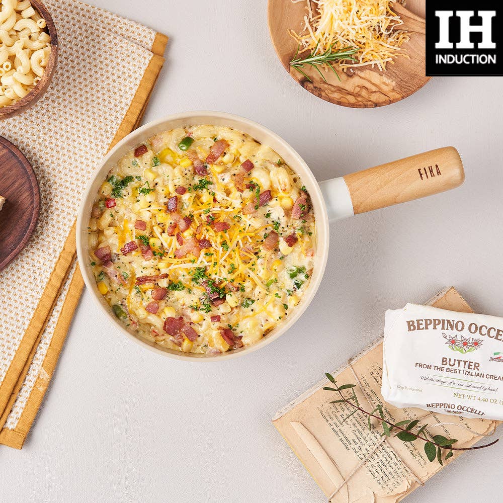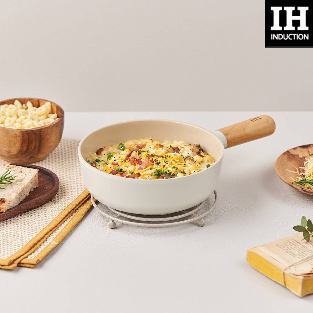Crafted with Scandinavian-inspired design, this award-winning wokpan features soft round contours, a matte off-white exterior, and a glossy sand-colored ceramic interior. The wooden non-slip handle feels warm and comfortable in hand, making everyday cooking calm, intentional, and enjoyable.