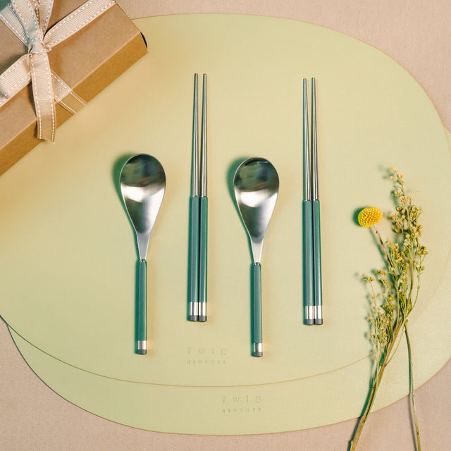 This refined 4-piece set includes two pairs of chopsticks and two soup spoons, perfectly suited for enjoying noodles, soups, and stews. Made from premium 18-10 stainless steel, each utensil features a smooth satin finish that feels effortlessly modern and inviting.