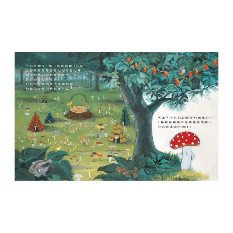 在森林舉辦的「帽子選美大賽」這一天,菇菇們輪流站上舞台,展示自己珍藏的帽子。不過,貝尼一點也不覺得別人的帽子好看,他始終認為——自己的圓點帽才是最棒的!即使朋友們熱情邀請他試試其他帽子,貝尼也始終不肯放下堅持。