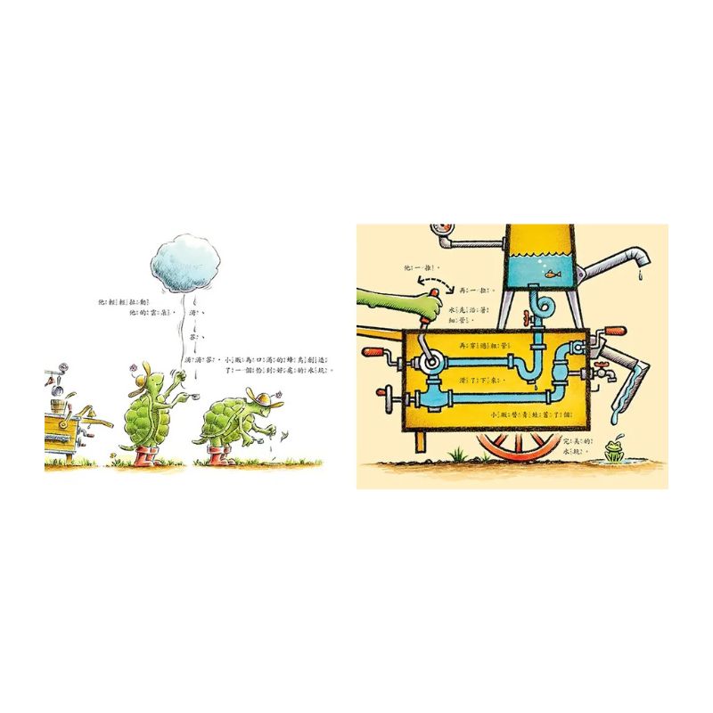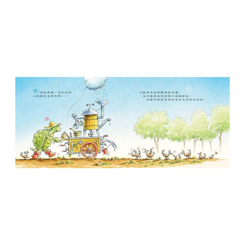 烏龜小販推著他的手推車,穿梭在森林、田野與海岸之間,為動物朋友們打造一個又一個剛剛好的水坑。鴨子在水中嬉戲、青蛙恢復活力、口渴的蜂鳥得到解渴的水源——烏龜小販總是默默付出,從不要求回報。