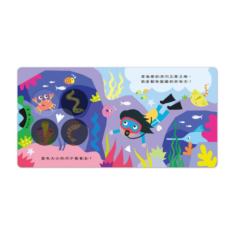《神奇探索轉轉書-海洋尋寶》邀請孩子一起潛入神秘的海底世界,透過轉一轉魔法轉盤、找一找躲藏其中的海洋生物,在遊戲中學習知識。書中以淺顯易懂的文字搭配可愛插圖,結合大字型與注音設計,讓低幼齡孩子也能輕鬆閱讀。
