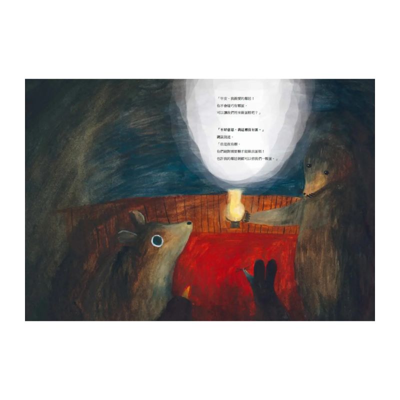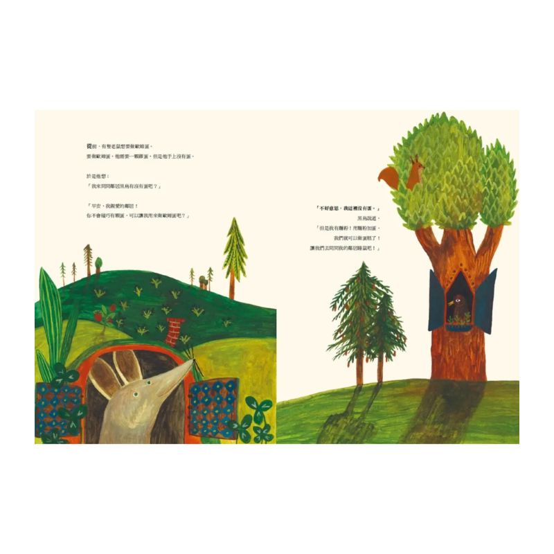 睡鼠、鼴鼠、刺蝟、浣熊、蜥蜴、蝙蝠……每一位鄰居都拿出了自己擁有的材料,最後,他們終於在貓頭鷹家,一起烤出了美味的蛋糕。