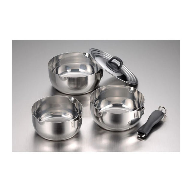 Experience the perfection of Japanese cooking with Yukihira Saucepan Set. This 5-piece set includes 3 different sized pots, a versatile lid, and a detachable handle. Perfectly sized at 16, 18, and 20 cm, these pots are a must-have in any home kitchen or outdoor camping. The handle can be easily removed, allowing for compact storage. Effortlessly operate the pot by pulling the lever and hanging it up. Its practical scale and convenient spout make cooking a breeze. Perfect for any cooking enthusiast!