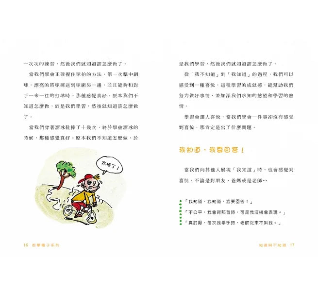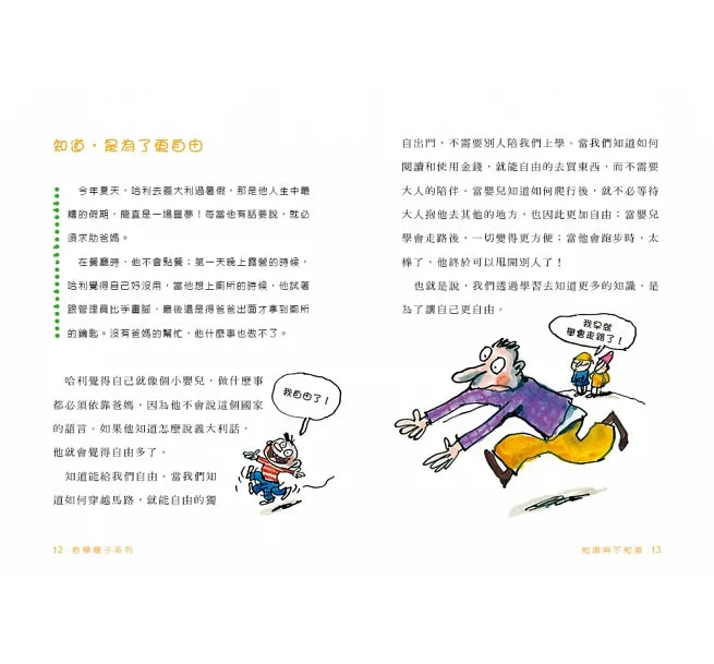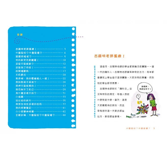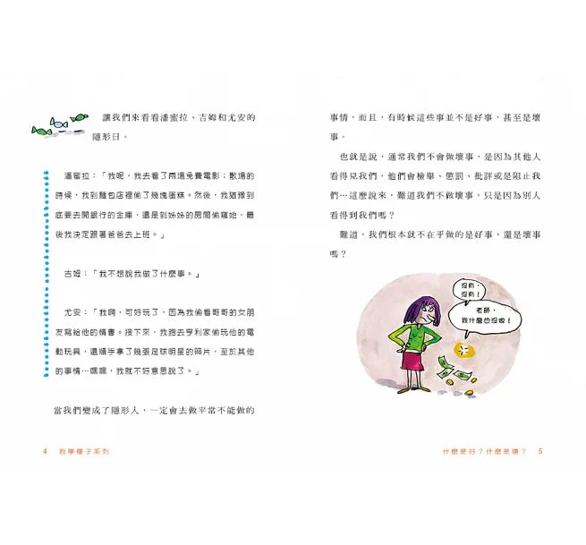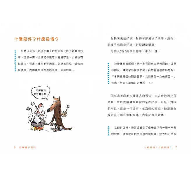以輕鬆幽默的故事,引導孩子思考生活中遭遇的問題,如:公平、好壞、自由、工作或美醜…從多元角度出發,幫助孩子建立自我觀點,學習對自己的想法負責。