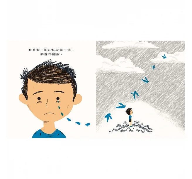 書中使用特別色印刷,用明朗的藍色傳遞一種穩定的力量。在溫暖的圖文中,帶讀者一起面對壞情緒,每個人都有想哭的時候,所以可以彼此了解、彼此分享,不論是好心情、壞心情,都像天空有晴有雨那樣自然。