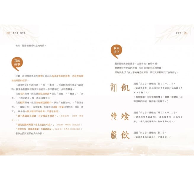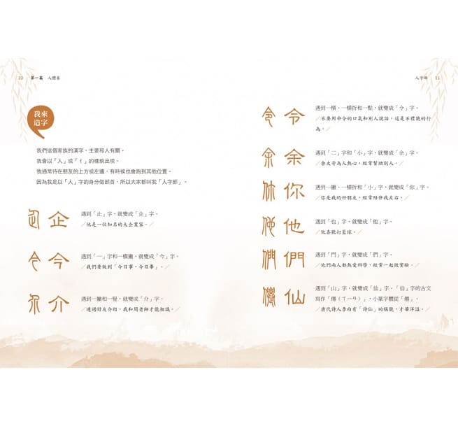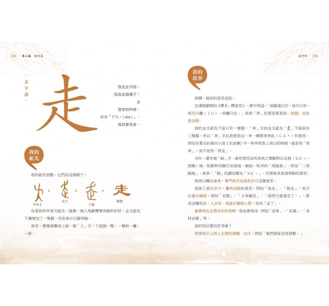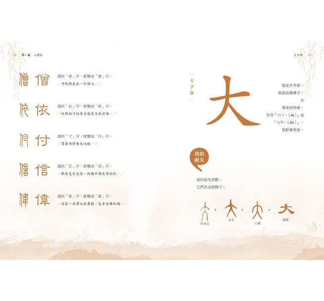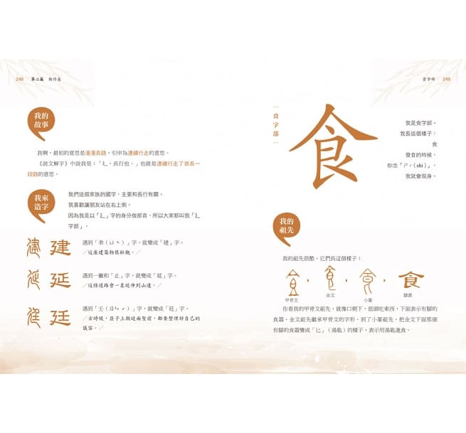 每一個部首由「我的祖先」、「我的故事」、「我來造字」三部分組成,從簡到繁,循序漸進介紹各個部首,透過妙趣橫生的文字說明,激發大朋友和小朋友們的奇特想像、思考方式,並能學習巧妙地跨越和銜接,舉一反三,衍伸出更多的單字和詞語。