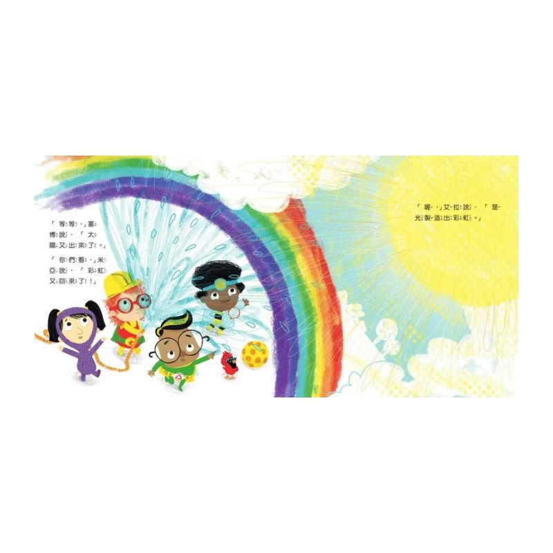 在一個晴朗的大熱天,科學寶寶們用花園的水管噴水,讓空氣變得清涼。噴灑出來的水霧中,出現一道繽紛的彩虹,大家很驚嘆,覺得好像變魔術一樣。