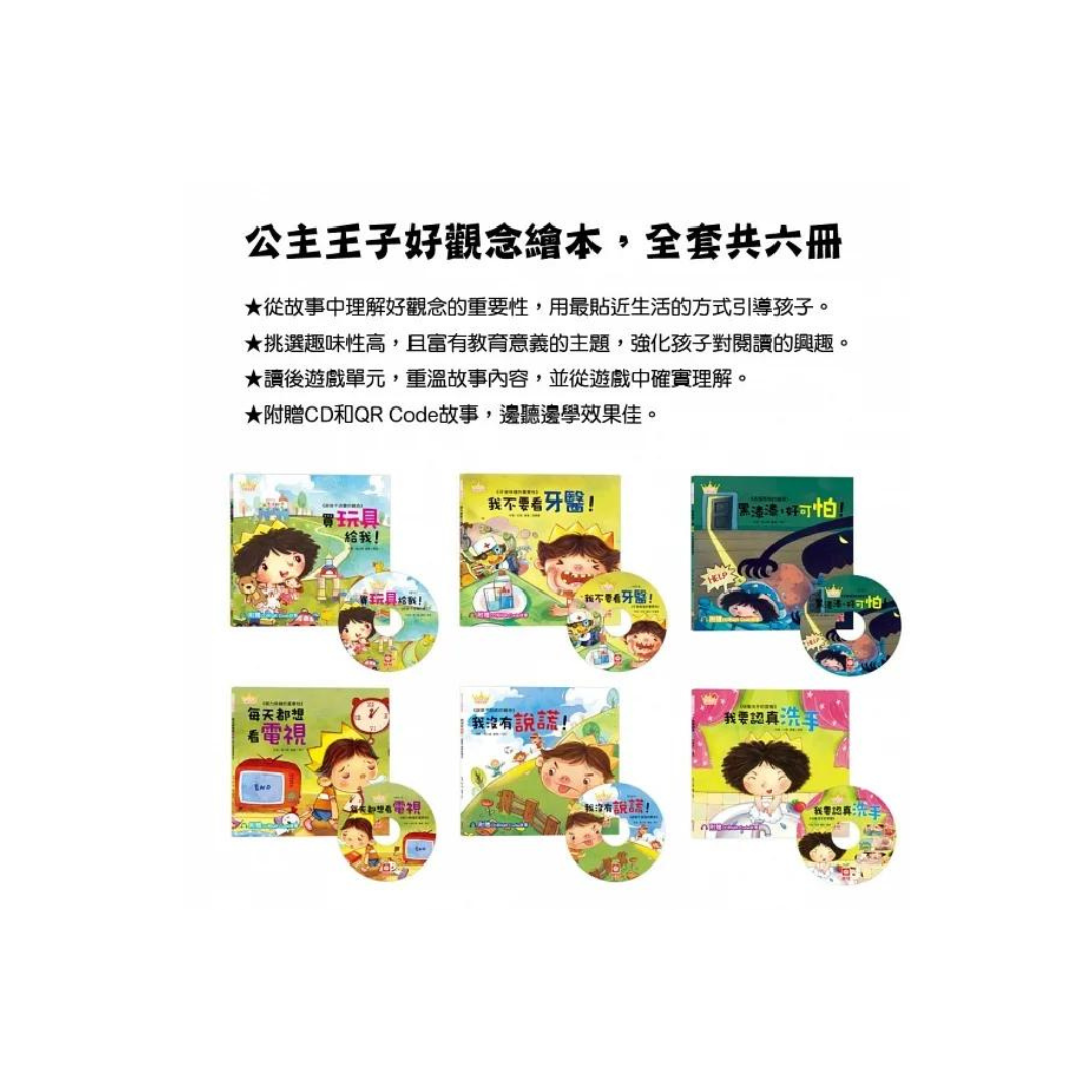 《公主王子好觀念繪本》共六冊,有勤儉不浪費、牙齒與視力保健、學習誠實負責等不同主題,透過淺顯易懂、寓意深遠的故事,讓孩子們在閱讀的過程中,理解好觀念的重要性;家長們也能在書末收穫許多幼教小叮嚀,大人小孩一起學習。