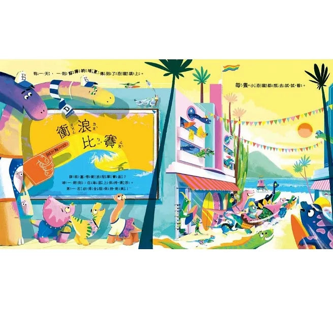 故事裡的主角恐龍蒂娜,是恐龍城中能歌善舞的風雲人物,某天,城裡傳來了衝浪比賽的消息。多才多藝的蒂娜信心滿滿,覺得自己肯定一下就上手,便和其他人一樣躍躍欲試,準備在比賽中大顯身手。