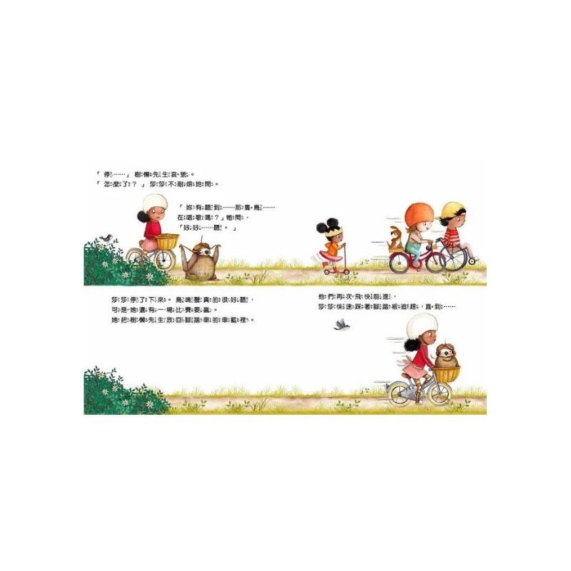 故事裡的莎莎,便是這樣一個凡事都追求「快還要更快」的孩子,卻在無意間遇上了「慢到不行」的樹懶先生。然而,在兩個人的相處過程中,樹懶先生教會了莎莎慢下腳步、用心去發現許多她不曾注意過也不曾想到過、體驗過的事物,例如:參與競速比賽的時候,追求速度無妨;但有時要完成一個藝術作品,則需要慢下來細細雕琢;騎腳踏車時,不是只急著趕到目的地,也要懂得欣賞路上風景,懂得聞一聞花香,聽一聽鳥鳴……莎莎漸漸明白,其實除了「快速」、除了「完成」,「做好的過程」也很重要,而且蘊藏著許多樂趣。