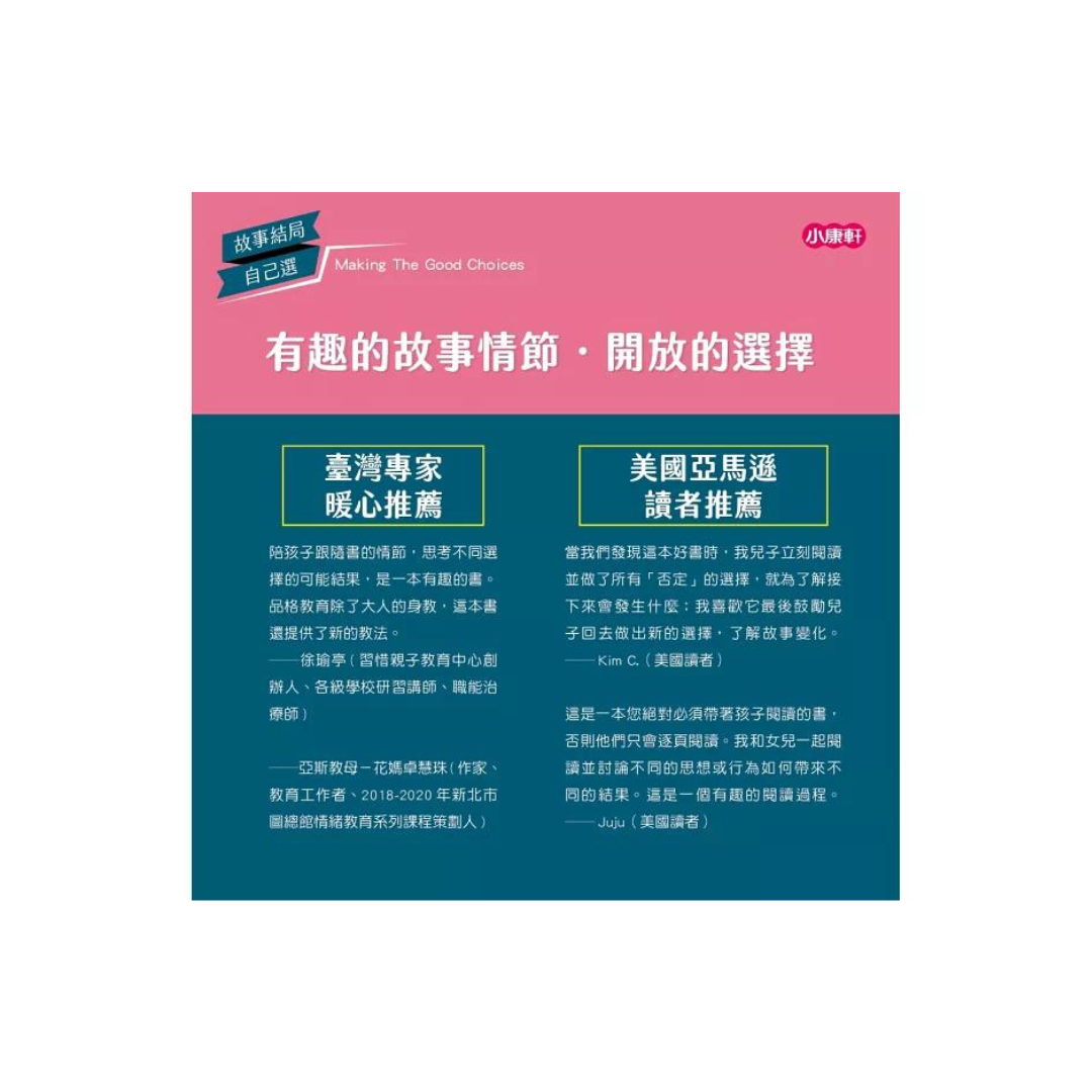 本系列為互動式繪本,劇情走向由孩子決定,讓孩子學習做選擇,培養判斷力。系列主題包含負責任、遵守規定、誠實、自律、處理衝突、控制音量、遵守規則、有禮貌等。非常適合學齡前至中低年級兒童閱讀!