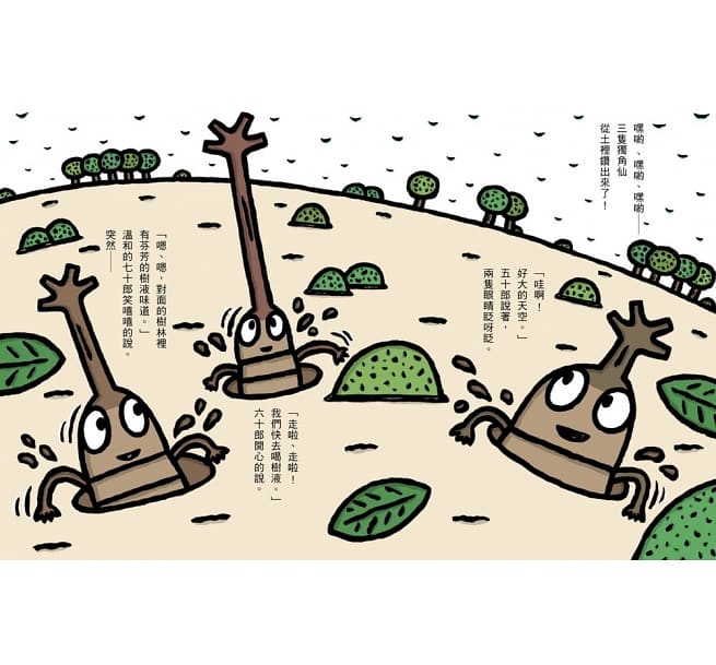 這是發生在很久很久以前的事。三隻獨角仙寶寶從土裡鑽出來,分別是獨角仙五十郎、獨角仙六十郎,以及獨角仙七十郎。