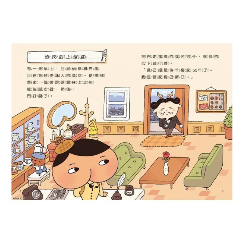 【屁屁偵探讀本】,是以小學低、中年級自行閱讀為主要對象的全新系列,中文版內文特別加註注音,此系列在情節設計鋪陳上,按部就班、循序漸進地增加更多語文、記憶、觀察、分析、邏輯推演……的挑戰。每冊書衣裡也都特別設計「大家來找碴」的延伸遊戲。