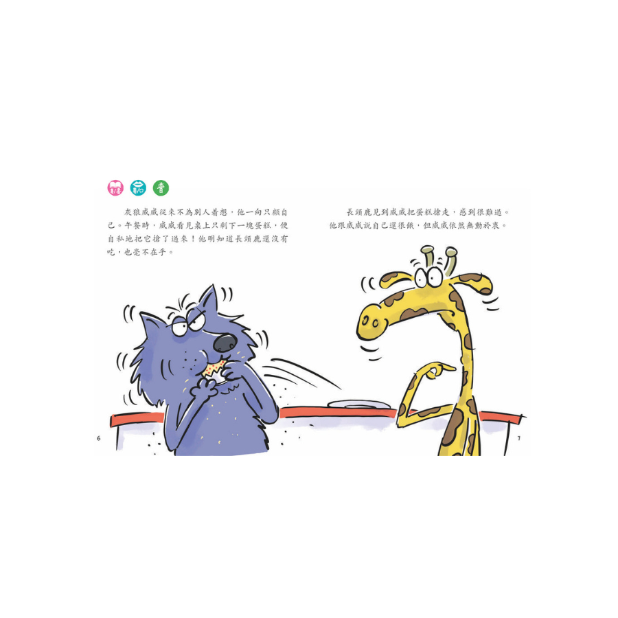 本系列共16冊,各冊以不同動物為主角,他們會遭遇普遍孩子遇到的困境,幸好他們最後都能發揮相關的性格強項,完滿地解決事情,學懂待人接物。現在,就跟鱷魚卡卡和斑馬敏敏學毅力、豹子達達學團隊精神、河馬胖胖學正直、猴子奇奇學審慎、老虎哈哈和奇異鳥滔滔學自我規範、大象波波學公平、長頸鹿高高學仁慈、猴子安安學希望、烏龜娜娜學勇敢、灰狼威威學愛、犀牛魯魯和熊貓元元學社交智慧、樹懶樂樂學熱情與幹勁、樹熊思思學開明思想吧!