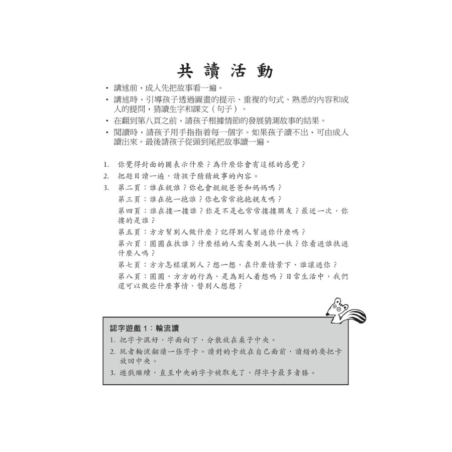 採用全語文閱讀方法,專注於閱讀和語言發展。故事中使用重複句式、細緻插圖和成人提問,讓孩子邊讀邊猜測故事的發展,從而培養觀察力、聯想力和猜測能力等基本閱讀技巧。 -