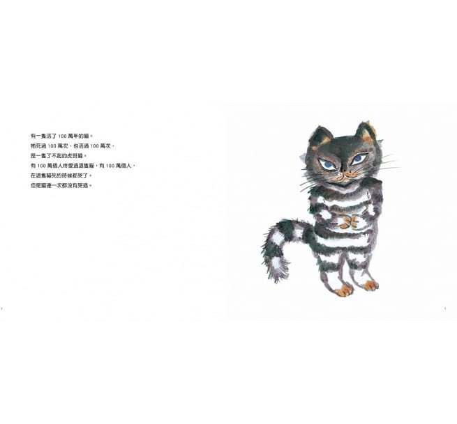 有一隻貓,他死了100萬次,也活了100萬次,有100萬個人愛過他。每一次牠死去時,牠的主人都為他哭得很傷心,但這隻活了100萬次的貓,卻一次也沒有哭過,牠從來都沒有愛過誰。有一次,牠成了一隻真正的野貓,自由自在地過日子,享受其他貓咪的仰慕,直到牠終於遇見了一隻心儀的白貓,第一次,牠,愛上了別人……。