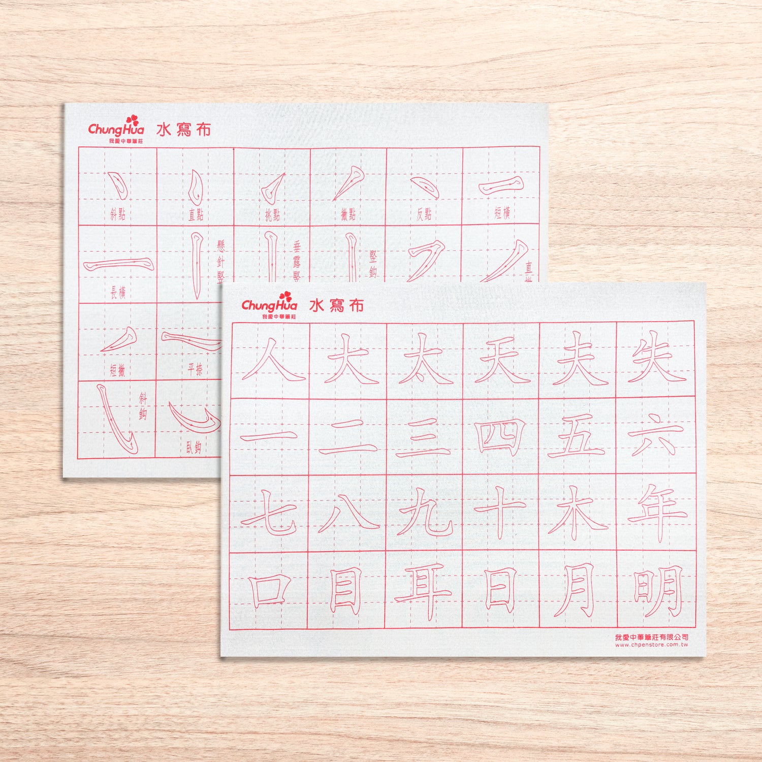 Designed for practicing traditional Chinese calligraphy using water only—no ink needed. The set includes one Basic Stroke Tracing Practice Cloth and one Standard Kaishu (Regular Script) Tracing Practice Cloth, helping beginners learn through guided tracing before moving into free writing.