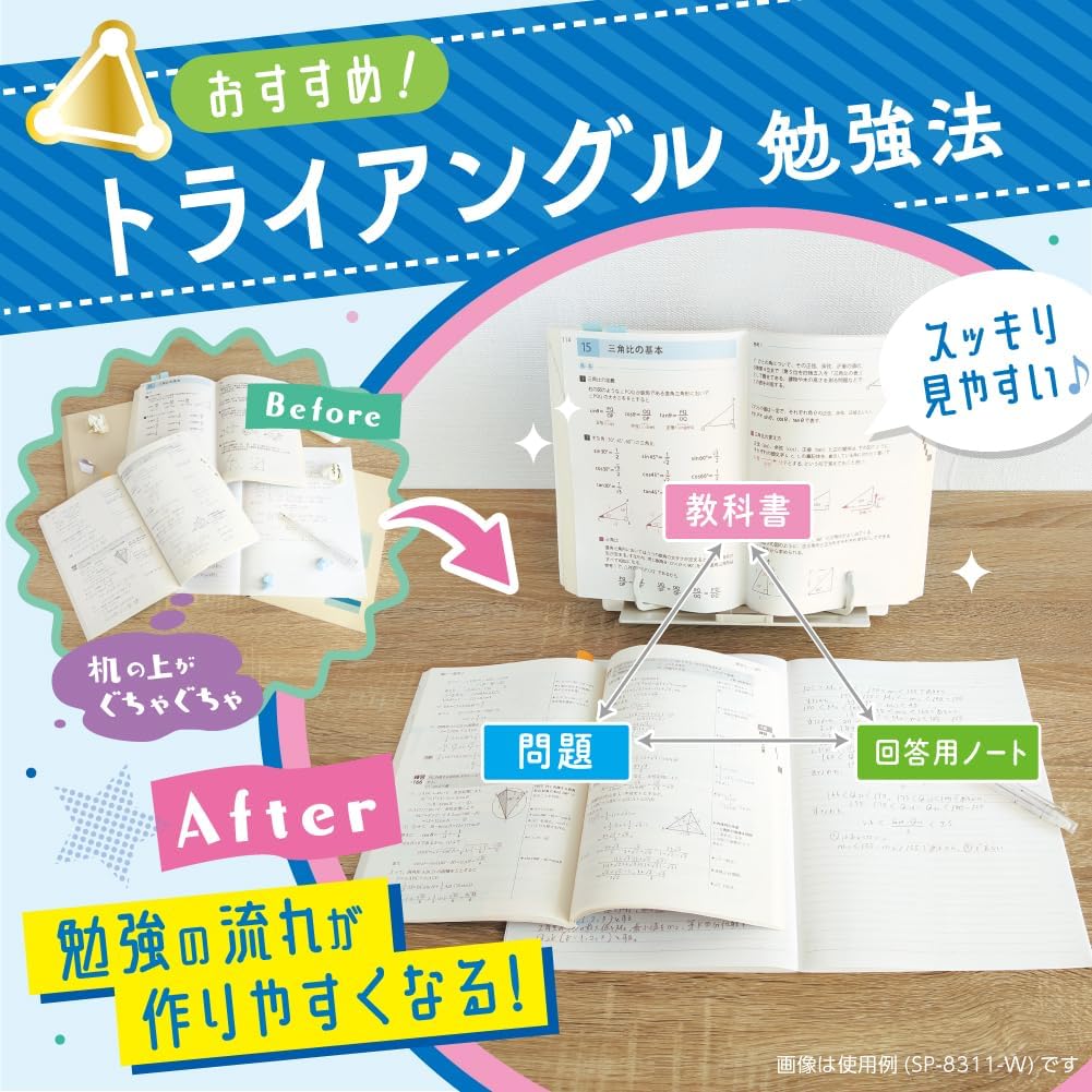 Keep your books organized and easy to view. Arrange your study tools in a triangular layout for a clutter-free workspace that promotes focus. Equipped with page stoppers, you can hold your book open for hands-free convenience.