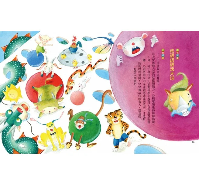 1、以藏有「十二生肖」的動物成語發展出有趣故事,看故事之前,設有填字遊戲的關卡讓小讀者挑戰,用活潑、互動方式認識更多成語。
