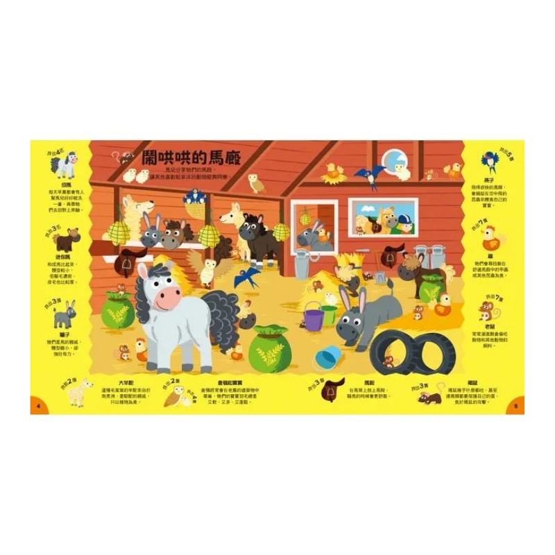 ★找一找加強觀察力:每跨頁超過10種不同的動物造型尋找主題,依照各種不同的飼養環境做分類,高達140個尋找目標,每種動物及農作物的獨特樣貌,都能吸引孩子的目光,引發他們從中尋找的樂趣,並在遊戲過程中培養孩子的觀察力、集中注意力。