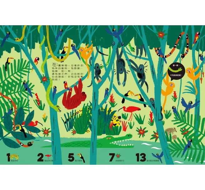 找找看,叢林裡有13隻金剛鸚鵡、海洋裡有6隻小海龜,你都找到了嗎?