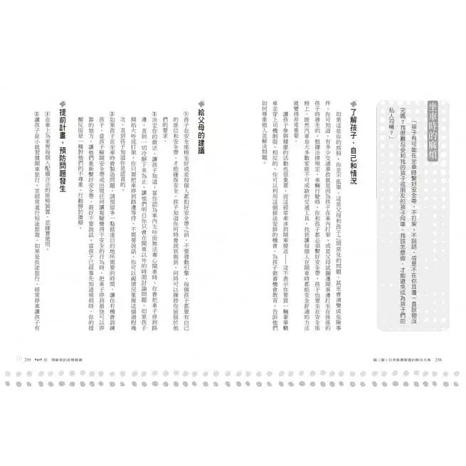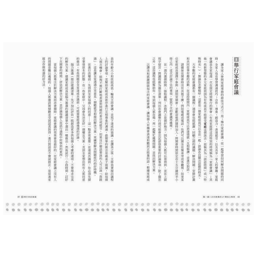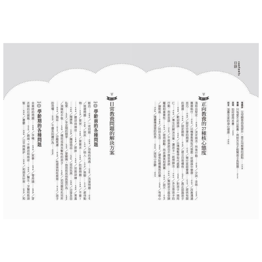 第一部從教養態度、父母作為、親子溝通、家庭力量、規矩原則、理解與包容、尊重孩子的決定、情感的傳遞⋯⋯等,提點出正向教養的27種核心精神。