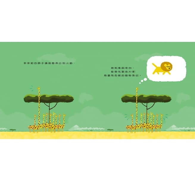 但有天,一隻猴子爬上一棵好高好高的猴麵包樹,他能望得比菲菲妮更高、更遠。從那天起長頸鹿們就不再需要菲菲妮,菲菲妮原先的角色被取代了!