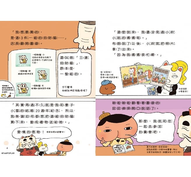 而店長為何那麼想用招財貓當作結婚紀念日的禮物呢?當中有什麼動人的故事?還有,身兼樓上鄰居與店內常客的屁屁偵探與布朗,為什麼從來不曾在「幸運貓」咖啡店見到小鈴小姐的媽媽──小雪女士呢?