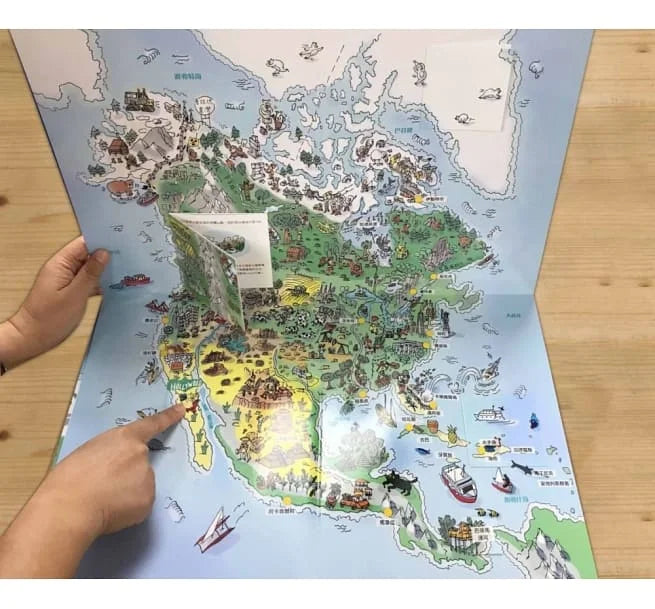 ★最吸引人的立體地圖:每一洲地圖上,以立體小書的方式附上特殊地理景觀或民族的介紹,像是北美洲的黃石國家公園、南美洲的亞馬遜熱帶雨林、以及中美洲的巴拿馬運河等等,為孩子補充重要的地理知識。