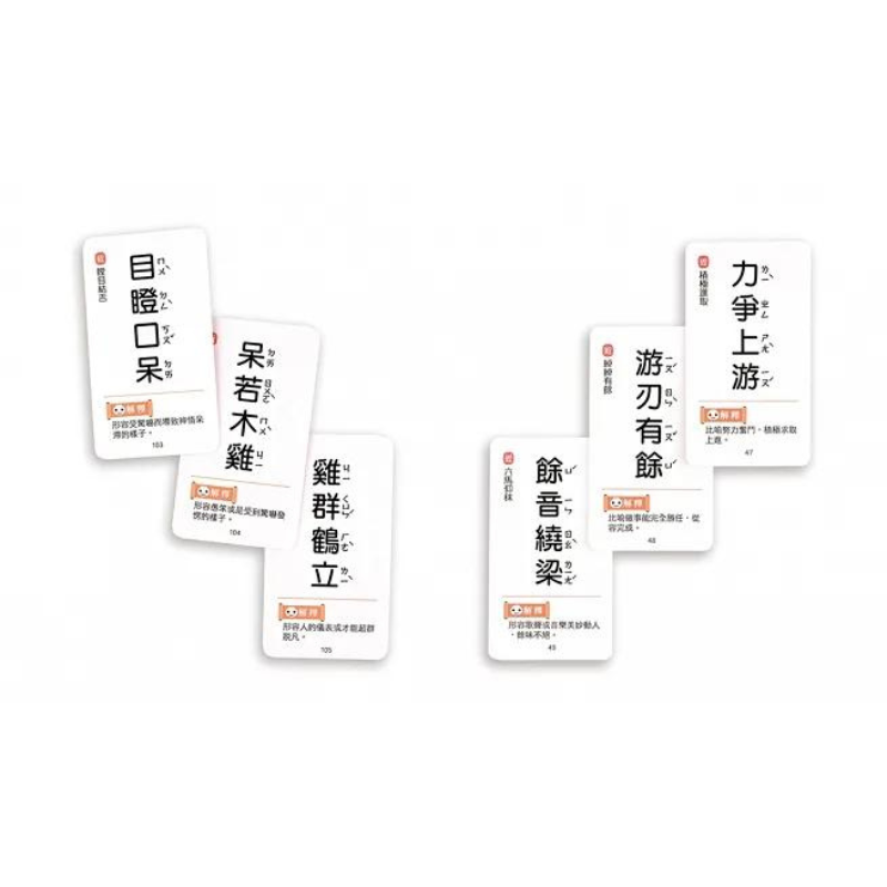 4.集思廣益:牌組放中央,輪流抽取並翻開正面,按牌搶答近義成語,答對者得牌,牌多者勝。