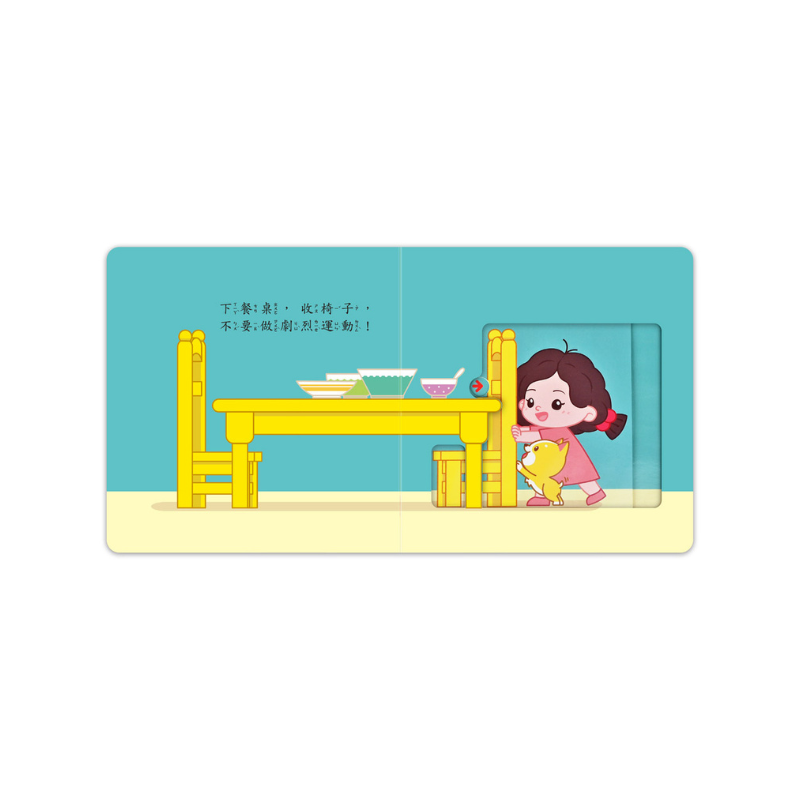 本書利用推推、拉拉、滑滑等多種互動機關,讓孩子能在閱讀過程中身歷其境,在遊戲中也能動動手指,促進手眼協調,並且強化手指的肌肉發展,除了遊戲外,也能在遊戲中學習,培養生活好習慣!