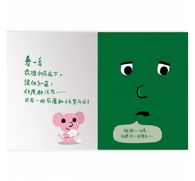 暗暗的地方、奇怪的聲音,把這本書嚇得臉都綠了,一直發抖!