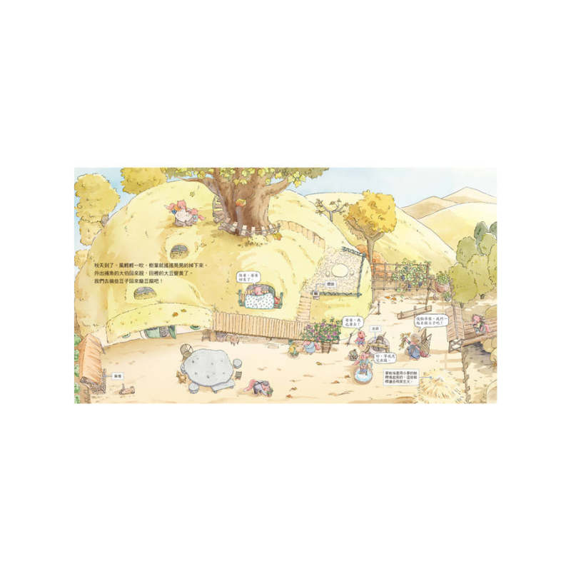 本書以秋天為背景,在大豆成熟時,和繪本中的主人翁一起採收大豆,製作許多豆製品,例如:豆腐、豆皮、豆花、豆腐乳、豆漿等。