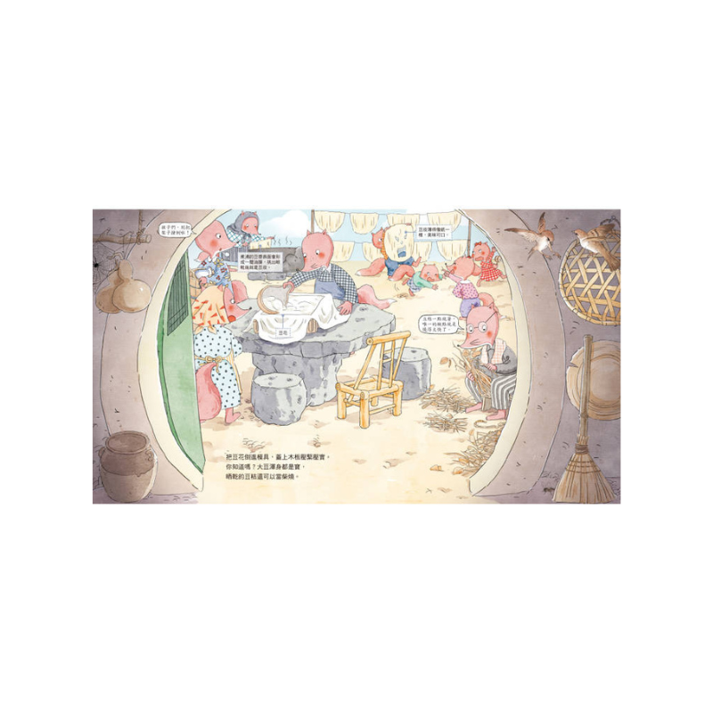 熟過頭的豆莢會自己炸開、豆莢上長了很多絨毛,碰到臉會有點癢癢的、生豆漿不能喝!、這是滷水,點豆腐的法寶……等好多日常生活小常識,融入繪本中的對話,以淺顯易懂的方式傳遞給讀者。