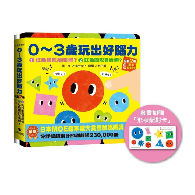 這樣充滿巧思的設計,不僅讓《紅色圓形是哪個?》榮獲第11屆日本MOE繪本屋大賞爸爸媽媽獎,暢銷姊妹作《紅色圓形有幾個?》同樣廣受好評,深受大人小孩喜愛,兩本書設計互相搭配,提供更豐富更多元的認知學習,至今在日本總印刷量已經累計超過二十三萬冊!更棒的是,套書特別加贈「形狀配對卡」,讓孩子從找一找、比一比的實際操作中,更理解形狀、顏色、大小等抽象概念。藉由反覆練習,刺激大腦神經迴路連結,玩出好腦力!親子一起享受共讀、對話、遊戲、互動的歡樂時光。